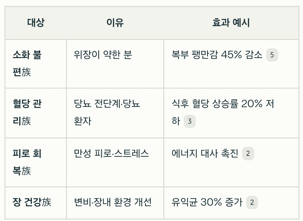 - 다이어트 보조: 식전 30분 섭취 – 포만감 유발