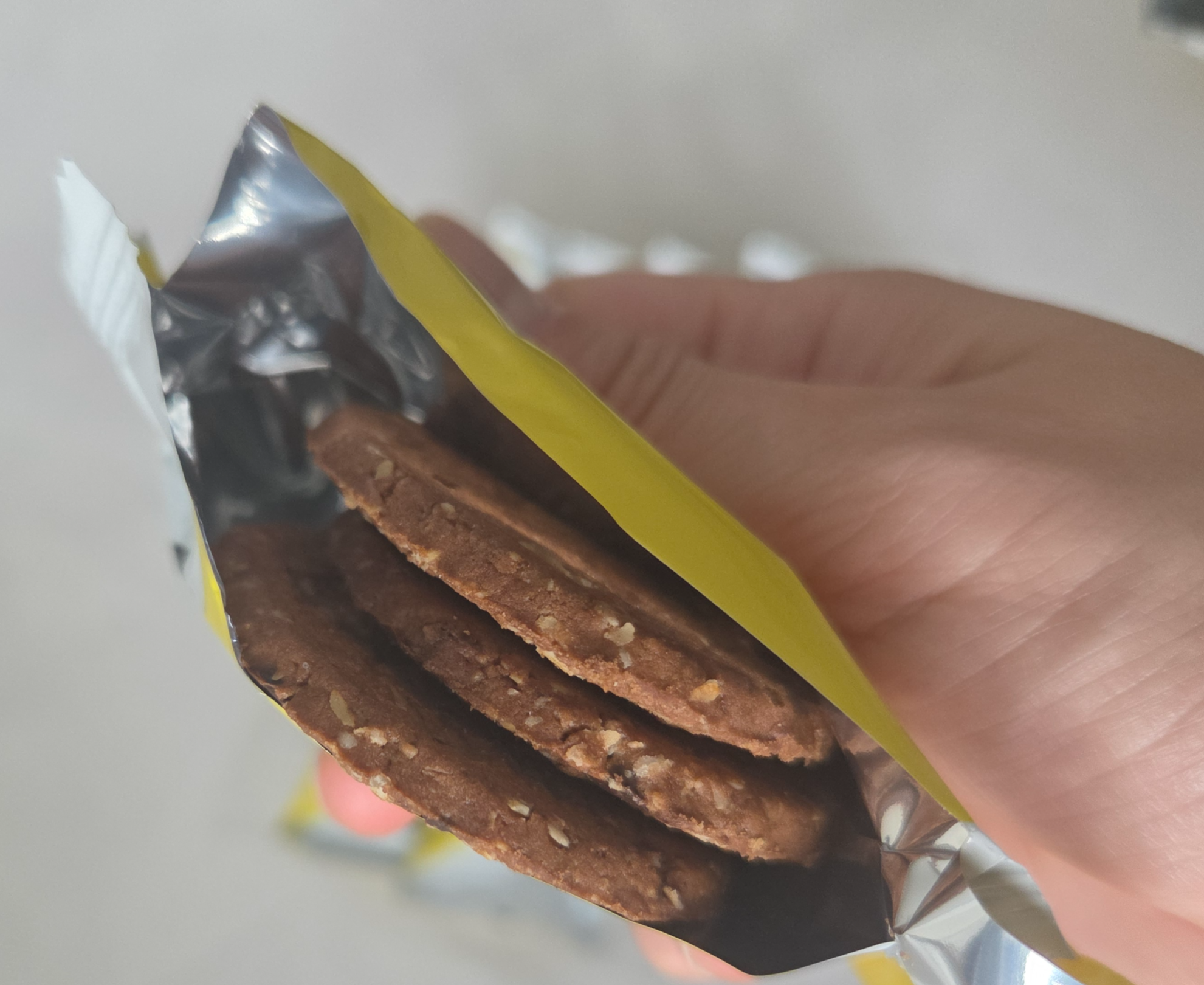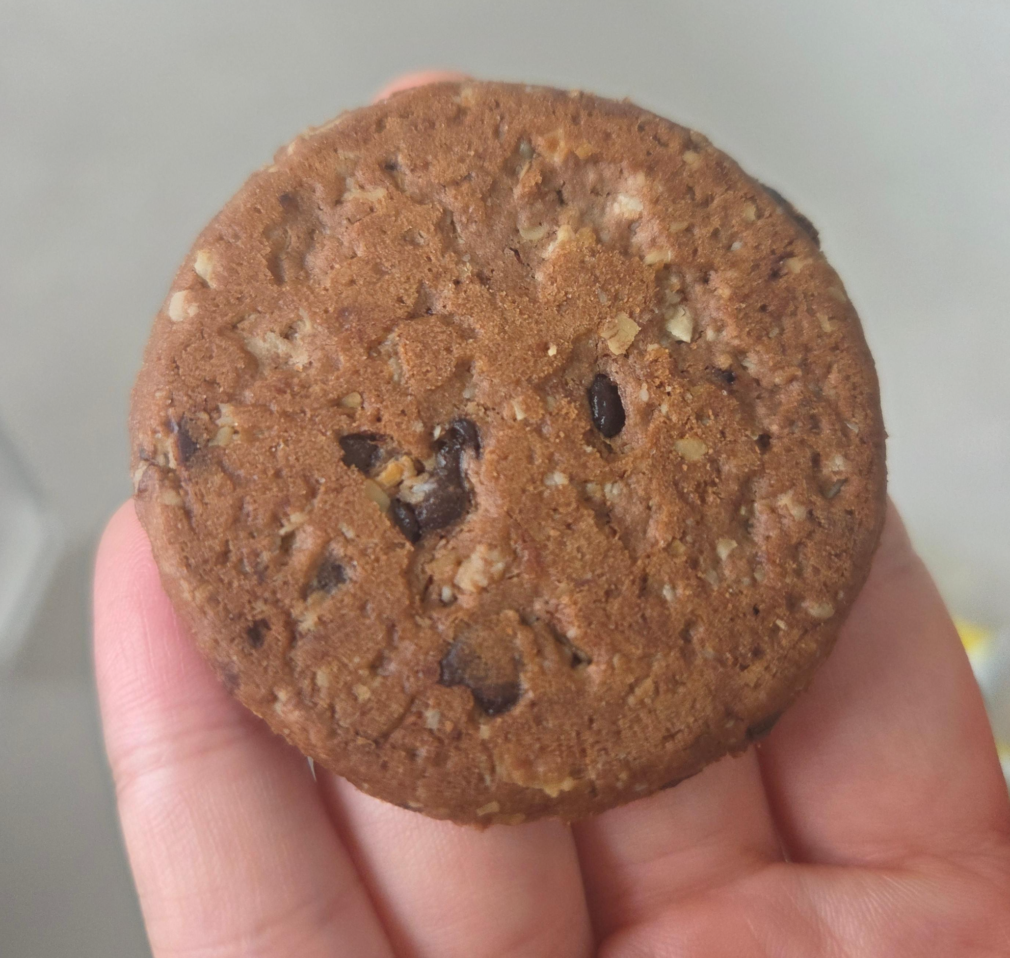 영양정보를 봤더니 귀리 플레이크랑 초코칩이 꽤 듬뿍 들어있고, 1팩 전체 칼로리는 무려 970칼로리! 역시 쿠키류라 칼로리는 만만치 않네요. 칼로리 걱정은 조금 있지만, 한 봉지에 3개씩 들어 있고 한 개당 크기는 마가렛트보다 살짝 크고 얇아서 부담 없이 한 입에 먹기 좋았어요.