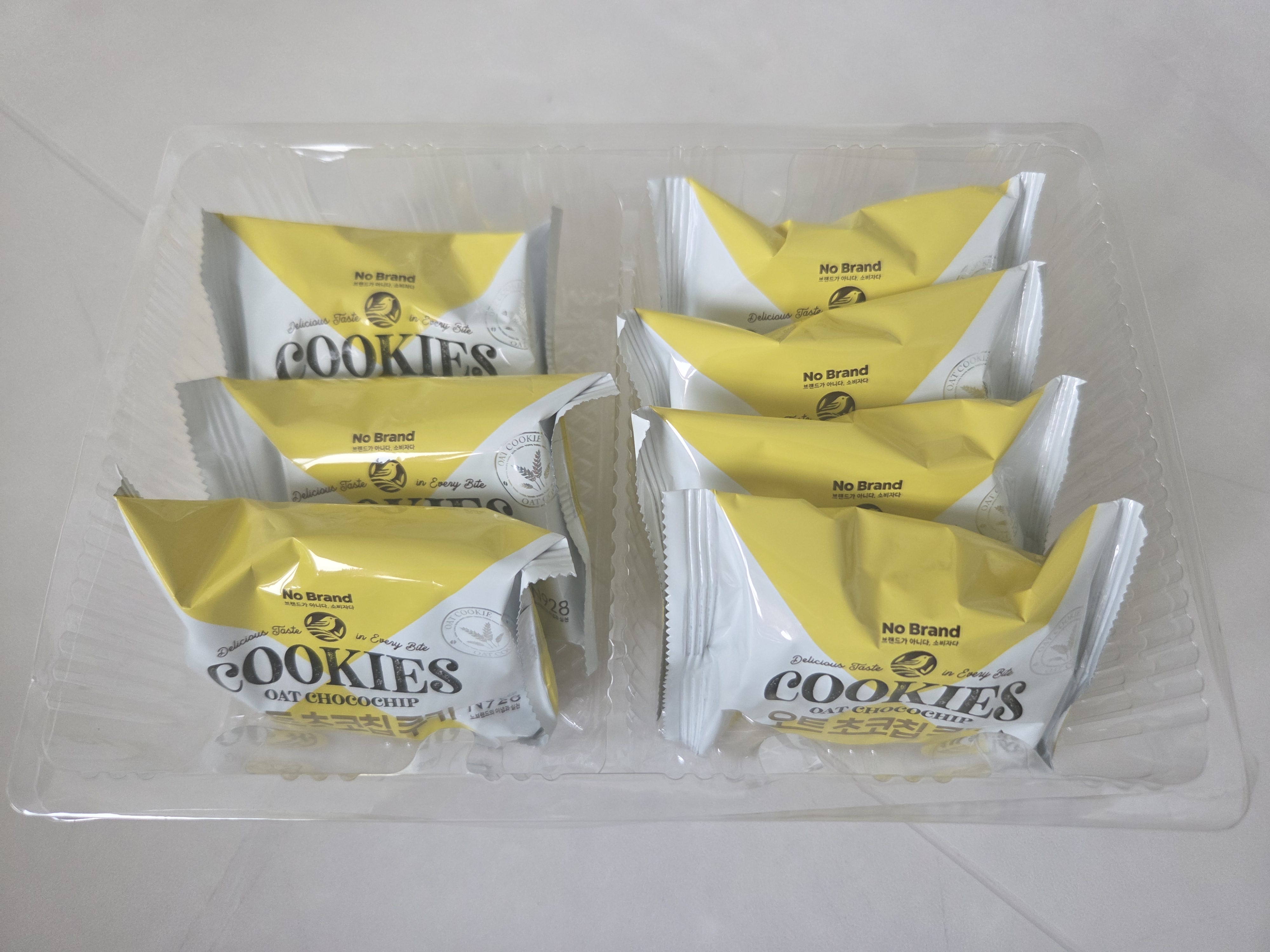 평소에 노브랜드 과자 추천을 많이 받다가 이번엔 오트 초코칩 쿠키에 직접 도전해봤습니다. 가격은 2,500원! 가성비로는 진짜 최고인데, 양도 넉넉해서 8봉지가 들어 있더라구요. 한 팩씩 까보면 귀엽게 3개씩 뭉쳐있는 쿠키 세트가 나와요. 과대포장 심하지 않고 소분포장이 잘 되어 있어서 회사 간식, 가방에 쏙 넣는 데 딱이죠.