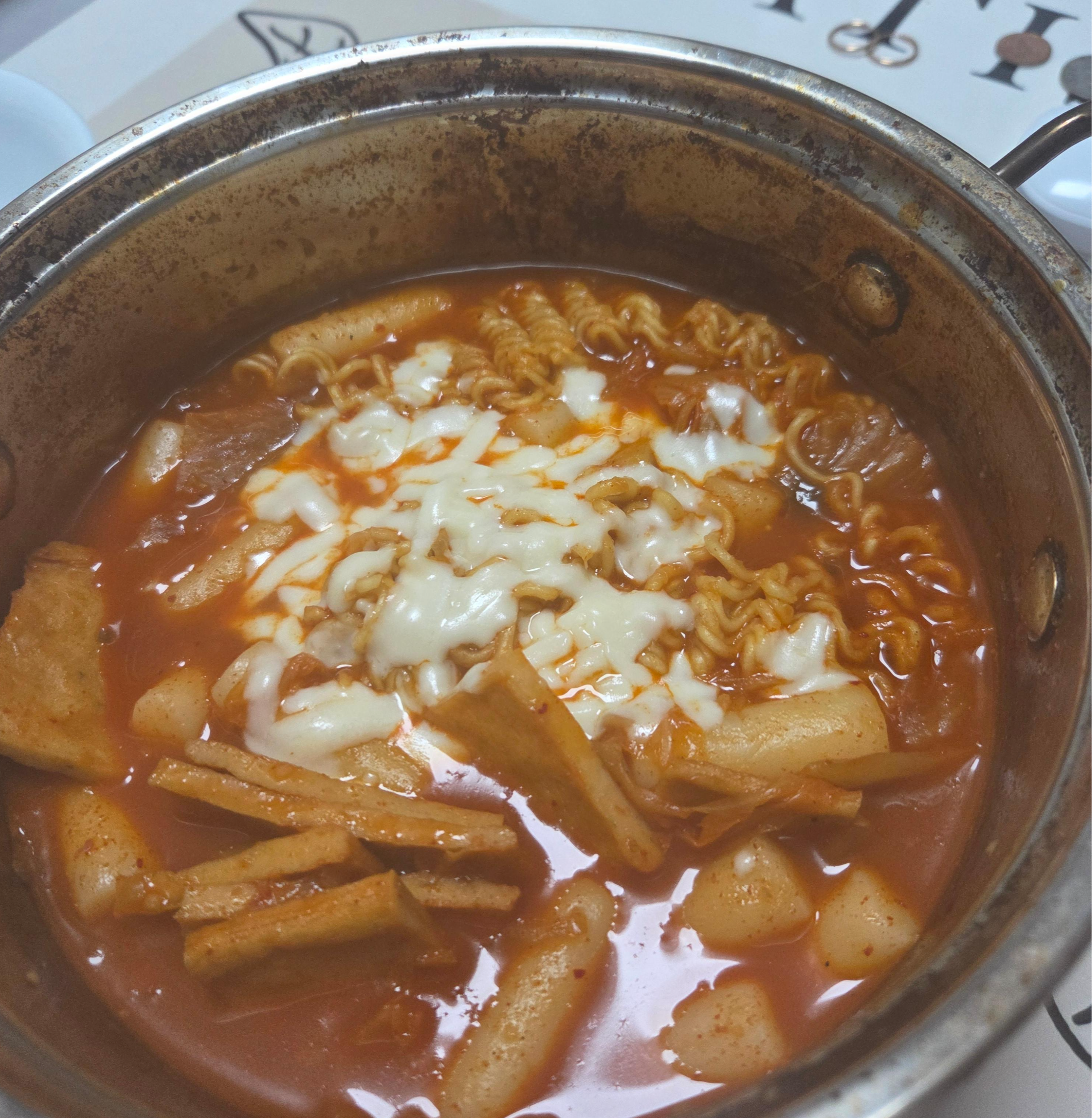 정식 레시피에는 물 500ml를 넣으라고 적혀 있지만, 국물이 진하고 걸쭉한 스타일을 선호한다면 450ml 정도만 넣어도 좋아요. 저도 450ml에 시작해서 보글보글 끓였어요! 떡과 어묵, 김치, 떡볶이 소스를 먼저 넣고 끓이다가 라면사리는 3~4분 뒤에, 치즈는 모두 완성 직전에 올리는 게 포인트랍니다. 치즈가 사르르~ 녹아들며 진한 풍미가 확 살아나요.