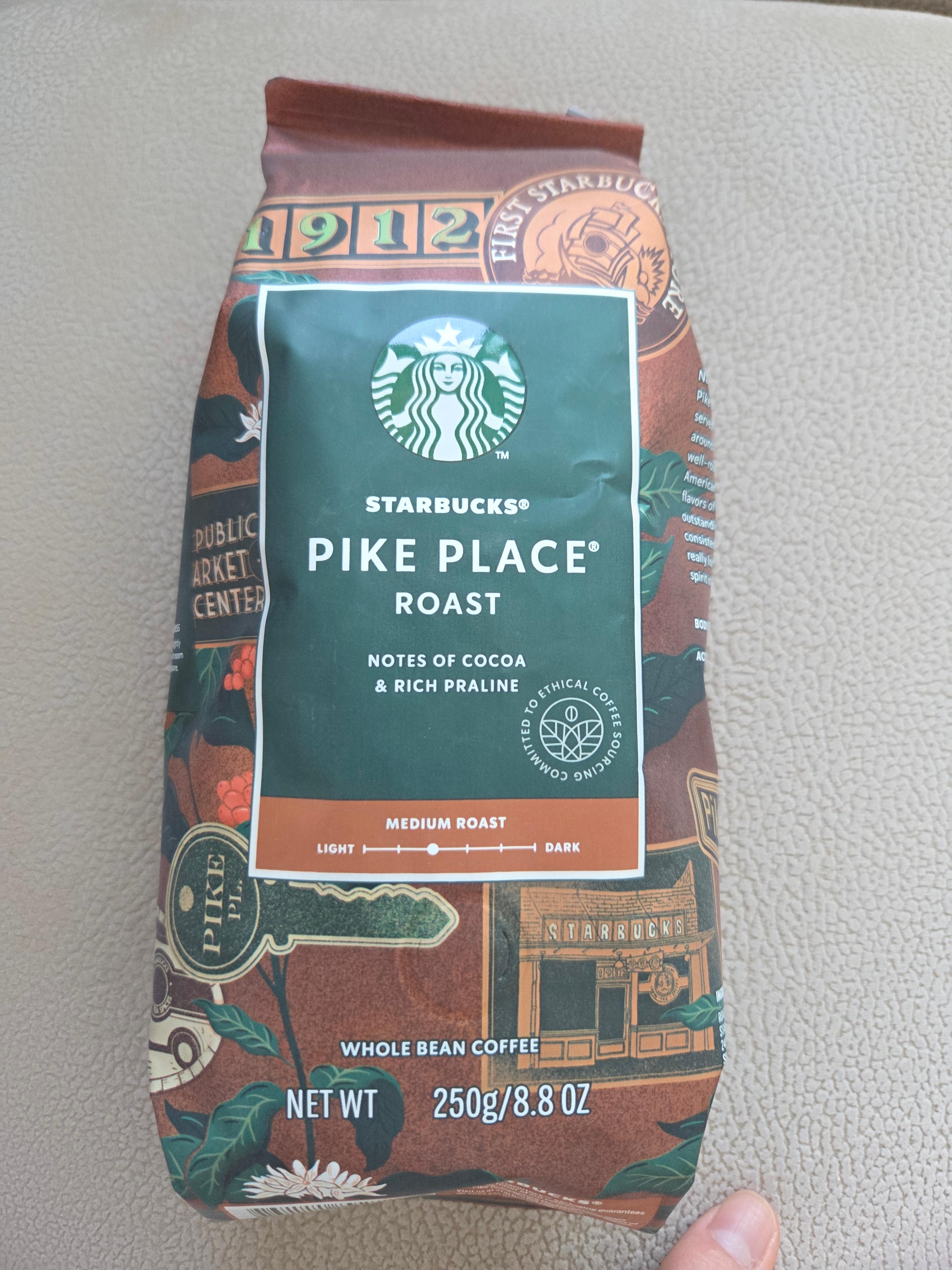 안녕하세요! 요즘 먹던 집 커피 원두가 똑 떨어져서 급 스타벅스 매장으로 향했어요. 스타벅스 원두는 종류도 많고 가격도 천차만별인데, 대체로 250g 한 봉지가 2만원대잖아요? 그런데 그중에 18,000원대 원두가 몇 개 있더군요. 그중 제 눈길을 사로잡은 건 바로 파이크 플레이스 로스트였어요. 이름부터 뭔가 찐한 느낌이 펑펑! 포장지에는 코코아와 리치한 프랄린 향이 적혀있더라고요. 프랄린이 뭐길래? 했더니, 설탕에 절인 견과류 디저트 종류라네요. 초콜릿과 견과류의 풍부한 향이라니, 얼른 개봉하고 싶었어요!