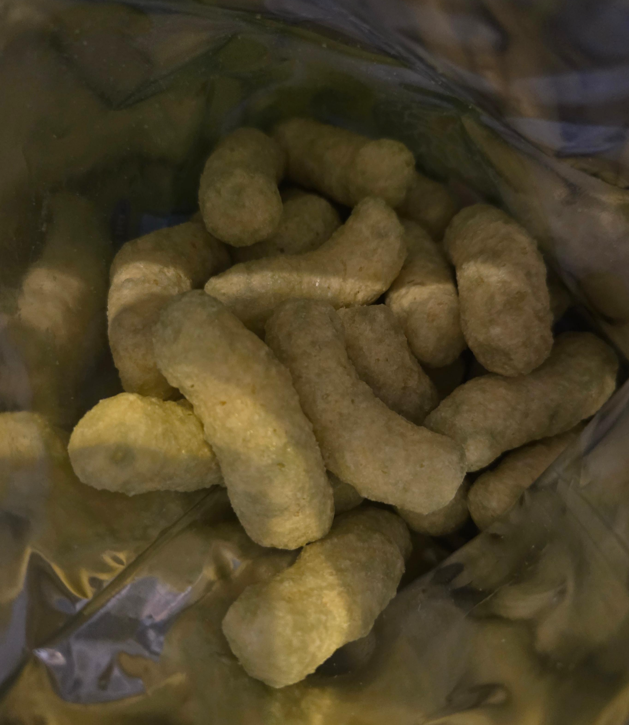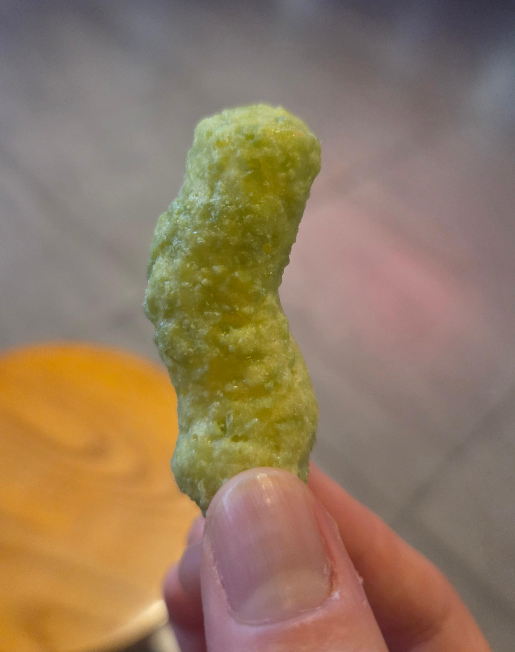 봉지를 뜯자마자 나오는 연두색의 메론킥은 모양만 봐선 바나나킥과 동일하지만 향부터 달랐어요. 특유의 시원하면서 달콤한 메론 아이스크림 향이 확 퍼져서 한입이 너무 기다려졌습니다.