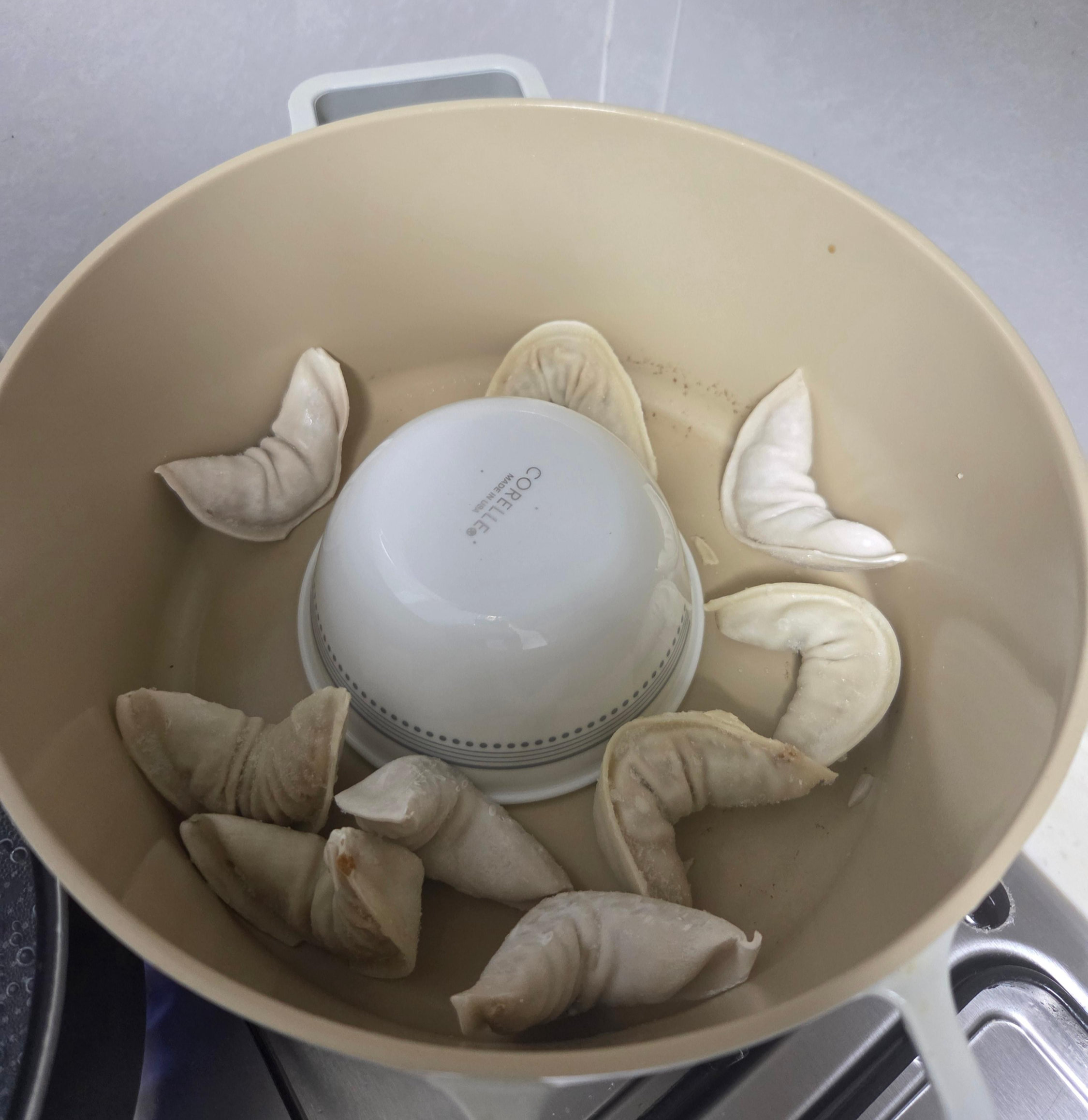 문제는 찜기가 없다는 거였죠! 그래서 급하게 꿀팁 하나 써먹었어요. 밥공기 하나를 냄비에 엎고, 그 위에 만두를 올리고 물을 머그컵 2/3 정도 붓는 거예요. 중강불에서 3분, 중불에서 5분 더 두면 완성! 다 쪄진 후 2~3분만 기다리면 물이 싹 흡수돼서 촉촉한 찐만두가 완성돼요. 찜기 없이도 잘 쪄지니 꿀팁으로 강력 추천해요.