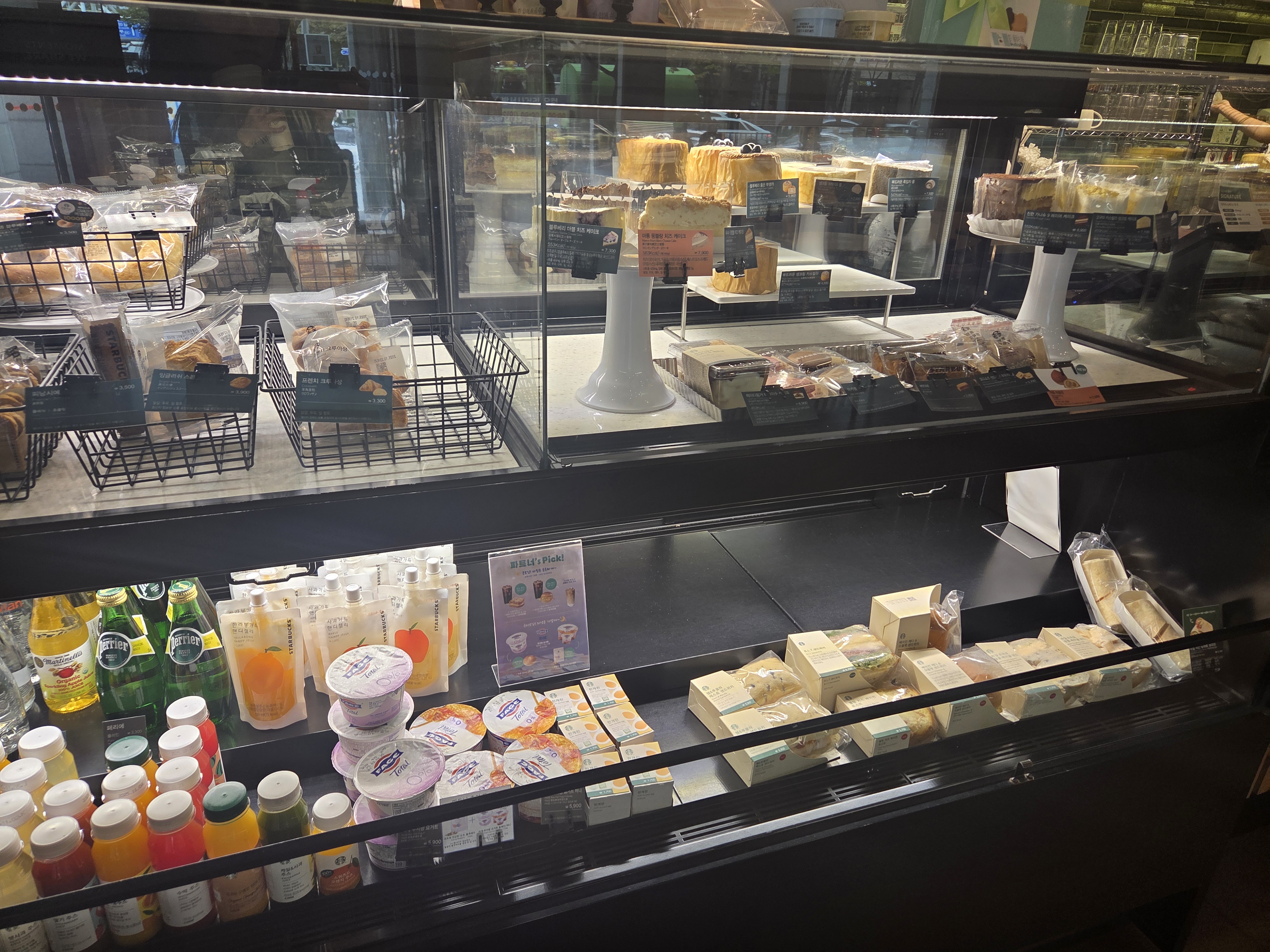 한 가지 아쉬운 점은 매장 내부에 화장실이 없다는 점이었어요. 오른쪽 문을 통해 나가면 오피스텔 건물 전용 화장실을 이용해야 합니다. 다행히 건물 청결관리가 잘 되어 있어서 불편함은 없지만, 매장 안에 전용 화장실이 있었다면 더 완벽했을 것 같아요. 그 외에는 만족스러웠어요. 디저트 코너에는 치즈케이크, 브리오슈, 크루아상 등 다양한 제품이 잘 진열되어 있었고, 시즌 한정 스타벅스 굿즈도 예쁘게 전시되어 있었답니다.